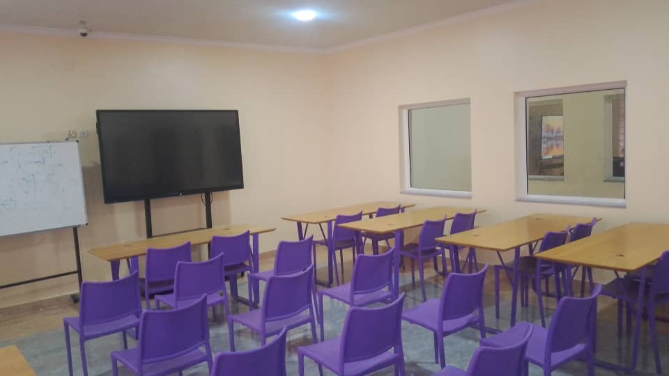 A professionally equipped training room designed for meetings, seminars, and brainstorming sessions. It features an interactive screen for virtual and instructor-led training, along with whiteboards for effective collaboration and planning. Ideal for corporate training, workshops, and strategic meetings.
