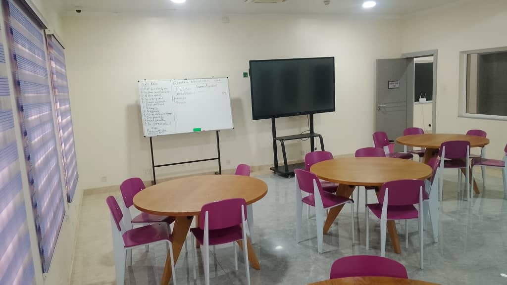 A modern brainstorming room designed for breakout sessions, equipped with an interactive screen for real time collaboration and digital presentations, alongside whiteboards for idea mapping and group discussions. The flexible layout supports teams, encouraging creativity, engagement, and productive collaboration.